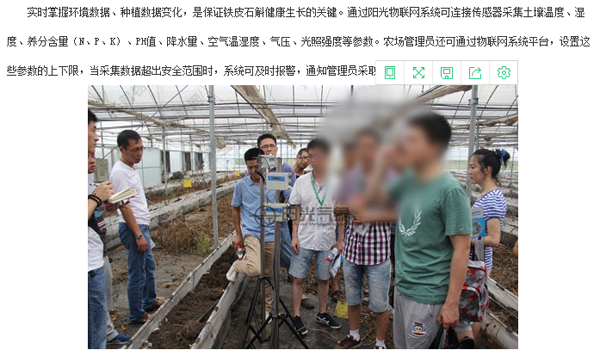 在《陽(yáng)光物聯(lián)網(wǎng)引領(lǐng)仙草(鐵皮石斛)種植新方式》一文中,不僅“學(xué)習(xí)”物聯(lián)網(wǎng)系統(tǒng)的建設(shè)原理,以及操作方式外,還引用當(dāng)時(shí)參觀時(shí)拍攝的圖片。為了降低圖片的辨識(shí)度,還對(duì)圖片進(jìn)行模糊處理。