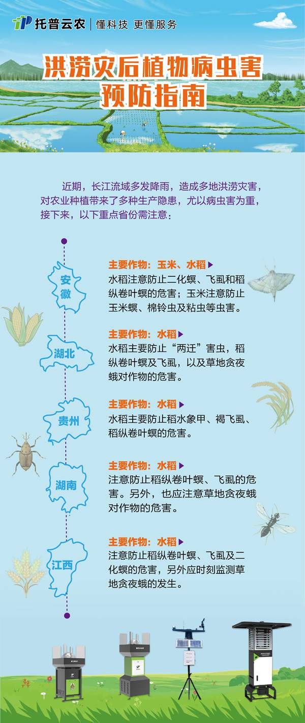 災后巡檢雖已結束,但災后生產還需長期防范,除了借助我們托普云農的智能裝備,大家還需要注意日常的病蟲害預防。我們特地整理了一份《病蟲害預防指南》,對各省重點蟲害做了介紹,希望對大家有所幫助!