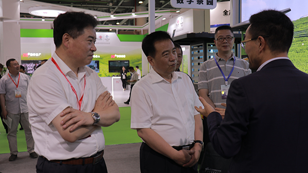 全國(guó)農(nóng)業(yè)技術(shù)推廣服務(wù)中心主任魏?jiǎn)⑽模ㄗ蠖@藝處處長(zhǎng)周澤宇(左一)、副處長(zhǎng)冷楊(右一)參觀托普云農(nóng)展位