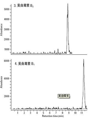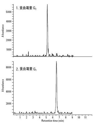 黃曲霉素是黃曲霉菌、寄生曲霉菌產(chǎn)生的代謝物,劇毒,同時(shí)有致癌、致畸等作用。會引起人體骨骼,內(nèi)臟器官等的病變,甚至癌變。黃曲霉菌廣泛存在于土壤中,因此一般的作物如花生、玉米、大米等農(nóng)作物都很容易感染黃曲霉菌。另外如胡桃、杏仁等干果也可能含有黃曲霉素。黃曲霉素的產(chǎn)生,不僅在種植過程中,還包括加工過程。黃曲霉素分為四種,B1、B2、G1、G2,其中黃曲霉素b1毒性最大。下面介紹下這四種黃曲霉素的MRM色譜圖。