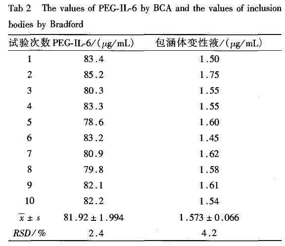 對Lowry法測得的IL-6樣品濃度為250 μg/mL,加入PEG修飾后再用BCA法測得的該樣品的濃度為246 μg/mL,說明PEG對BCA法沒有影響。對BCA法測定的包涵體變性液中蛋白濃度為25 mg/mL的樣品用Bradford法測得只有1.59 mg/mL,對照試驗顯示包涵體變性液中的β一巰基乙醇嚴重干擾BCA法,而對Bradford法無影響。由此可見,Bradford法適于檢測包涵體變性液。表2是連續10次對同一PEG-IL-6樣品用BCA法測定和同一包涵體變性液樣品用Bradford法測定的結果。