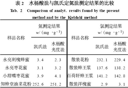 通過改進蜂產品蛋白質消化的條件,有效地縮短了反應時間,由原來的3. 5 h 縮至2 h 左右。由于水楊酸光度法樣品消化液不需要蒸餾,直接用于測定,更適宜于批量樣品的測定,水楊酸光度法與國標法比較無顯著性差異,所以水楊酸光度法因其操作簡便、準確、迅速,可用于蜂產品中蛋白質的測定。