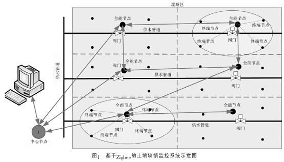 一般情況下, 根據(jù)灌溉工具在灌溉區(qū)的實(shí)際灌溉能力, 可將灌溉區(qū)劃分為若干個(gè)小灌溉塊,這些小灌溉塊通常可由1個(gè)全能節(jié)點(diǎn)和若干個(gè)終端節(jié)點(diǎn)組成一個(gè)小型的星型網(wǎng)絡(luò), 然后由全能節(jié)點(diǎn)控制小灌溉塊的供水閥門(mén), 并由終端節(jié)點(diǎn)負(fù)責(zé)采集該灌溉塊各個(gè)區(qū)域的土壤墑情。各個(gè)小灌溉塊之間的全能節(jié)點(diǎn)、終端節(jié)點(diǎn)與中心互連, 以構(gòu)成一個(gè)WSN網(wǎng)絡(luò), 網(wǎng)絡(luò)中只起路由功能的全能節(jié)點(diǎn), 可以保證網(wǎng)絡(luò)通信的可靠性。網(wǎng)絡(luò)組建成功后, 終端節(jié)點(diǎn)將定時(shí)采集土壤濕度數(shù)據(jù), 并將數(shù)據(jù)直接上傳給中心節(jié)點(diǎn), 同時(shí)也可以利用WSN網(wǎng)絡(luò)的多跳功能將數(shù)據(jù)傳輸給上級(jí)的全能節(jié)點(diǎn), 然后通過(guò)若干個(gè)全能節(jié)點(diǎn)地接力, 將數(shù)據(jù)傳送給中心節(jié)點(diǎn)。中心節(jié)點(diǎn)對(duì)信號(hào)進(jìn)行分析后, 再將分析結(jié)果發(fā)送給該小灌溉塊的全能節(jié)點(diǎn), 并通過(guò)全能節(jié)點(diǎn)來(lái)控制閥門(mén)以調(diào)節(jié)灌溉用水的用量。基于Zigbee的土壤墑情監(jiān)控系統(tǒng)示意圖如圖1所示。