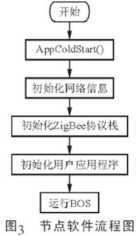 WSN網(wǎng)絡(luò)中各類節(jié)點(diǎn)的軟件流程如圖3所示。不同節(jié)點(diǎn)的軟件差異主要在于Zigbee協(xié)議棧的初始化。由于中心節(jié)點(diǎn)是網(wǎng)絡(luò)的建立者, 故在整個(gè)WSN網(wǎng)絡(luò)中必須最先啟動(dòng)。在初始化Zigbee協(xié)議棧時(shí), 通過(guò)調(diào)用afmeAddSimpleDesc () 函數(shù), 可在該函數(shù)中完成信道選擇并確定PAN ID, 從而完成網(wǎng)絡(luò)組建。全能節(jié)點(diǎn)和終端節(jié)點(diǎn)則可在初始化Zigbee協(xié)議棧時(shí), 通過(guò)調(diào)用afmeAddSimpleDesc ()函數(shù), 將待入網(wǎng)的節(jié)點(diǎn)初始化為全能節(jié)點(diǎn)或是終端節(jié)點(diǎn), 然后掃描所有可用信道以尋找與自身PAN ID匹配的網(wǎng)絡(luò)。當(dāng)掃描到匹配網(wǎng)絡(luò)后, 待入網(wǎng)節(jié)點(diǎn)將向中心節(jié)點(diǎn)發(fā)送入網(wǎng)請(qǐng)求數(shù)據(jù)幀, 當(dāng)接