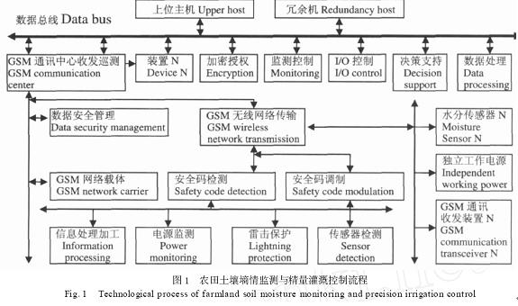 上位機(jī)通過串口連接無線巡測中心接收傳輸裝置,以GSM 網(wǎng)絡(luò)為載體的無線通信控制方式完成設(shè)計所要求的以雙向傳輸、多分支結(jié)構(gòu)形式的區(qū)域農(nóng)田墑情監(jiān)測網(wǎng)絡(luò)環(huán)境監(jiān)控。田間土壤水分采集傳感器通過微處理器完成底層區(qū)域灌溉的水分監(jiān)測和無線通信控制。系統(tǒng)不僅做到在GSM 網(wǎng)絡(luò)載體下的信息處理加工、安全信息管理、安全碼檢測與調(diào)制、傳感器檢測、電源監(jiān)測與雷擊保護(hù),且系統(tǒng)各部分控制相對獨(dú)立。