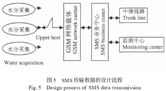 SMS(Short Messaging Service) 短消息業(yè)務(wù)是GSM 網(wǎng)的一項增值業(yè)務(wù),通過控制信道傳輸數(shù)據(jù),支持點(diǎn)對點(diǎn)消息業(yè)務(wù)及消息廣播業(yè)務(wù)等多種方式。水分采集的數(shù)據(jù)通過GSM 網(wǎng)全部發(fā)送到短消息業(yè)務(wù)中心,監(jiān)控中心通過中繼線路DDN (Digital Data Network) 從短消息業(yè)務(wù)中心獲取數(shù)據(jù) 。
