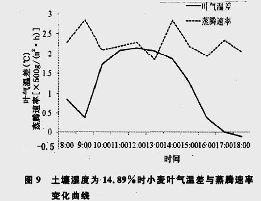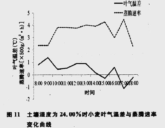 由圖7 - 11 可以看出,土壤濕度< 15 %時,在上午的11 :00 之前,蒸騰速率隨著小麥葉氣溫差的增加而加大,12 :00 之后,蒸騰速率并不隨著小麥葉氣溫差的增大而增強,未表現出規律性。當土壤濕度超過15 %以后,水分的充分供應既保證了較高的蒸騰速率,也有效降低了葉片溫度,減小了小麥葉氣溫差,從上午開始,小麥葉氣溫差和蒸騰速率的變化趨勢就相反。
