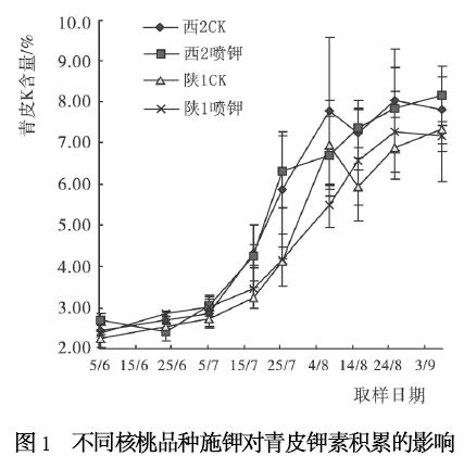 2. 1 噴施硫酸鉀對核桃青皮鉀素積累規律的影響如圖1 所示,噴施硫酸鉀處理并沒有對2 個核桃品種果實青皮鉀含量造成顯著的影響。在整個果實生長期內,各處理的果實青皮鉀含量變化曲線相似。6 月5日至7 月5 日,核桃果實發育進入果實迅速生長期和硬核期,青皮鉀含量基本保持穩定;之后到8 月7 日核桃果實發育進入油脂轉化期,青皮鉀素呈指數型積累,隨后鉀素積累趨勢變緩。對各取樣時期核桃果實青皮鉀含量進行方差分析表明,7 月17 日、7 月25 日、8 月15 日西2 和陜1 ,2 個核桃品種之間青皮鉀素含量差異顯著,噴鉀和對照之間沒有顯著差異;其余取樣時期各處理之間不存在顯著性差異。