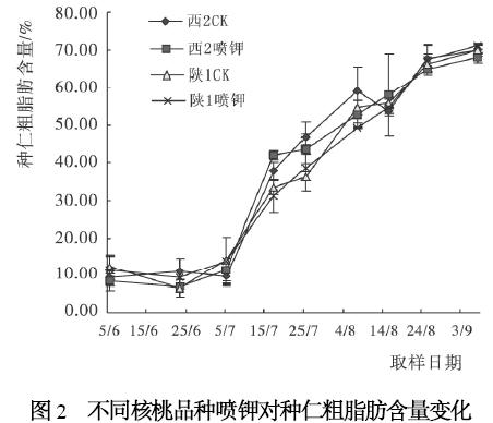 核桃種仁粗脂肪的積累規律不受品種和噴鉀與否的影響。7 月5 日前種仁粗脂肪含量基本保持穩定,之后進入油脂轉化期種仁粗脂肪含量呈指數型積累,如圖2 所示。經對不同采樣時期的種仁粗脂肪含量進行方差分析,結果表明:7 月17 日和7 月25 日采樣的核桃,西2和陜1 ,2 個品種種仁粗脂肪含量差異顯著,而噴鉀與否影響不顯著;相反,8 月7 日采樣的核桃,則是噴鉀處理顯著低于對照,而品種的影響并不顯著。