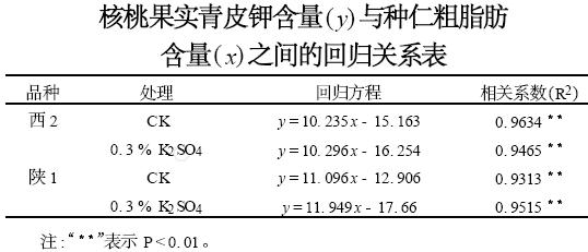 在整個果實生長期內,各處理的果實青皮鉀含量變化曲線和種仁粗脂肪含量變化曲線都保持著相似的趨勢(如圖1、2) 。由表可知,4 處理的核桃果實青皮鉀含量和種仁粗脂肪含量呈極顯著線性正相關(4 個處理P <0. 01) ,核桃果實青皮鉀含量與種仁粗脂肪含量之間的線性關系斜率分別為10. 235 (西2 ,CK) 、10. 296 (西2 ,噴鉀) 、11. 096(陜1 ,CK)和11. 949(陜1 ,噴鉀) ,噴鉀處理的斜率大于對照,陜1 的斜率大于西2 ,表明前者青皮鉀素積累對種仁粗脂肪積累的影響優于后者;4 處理相關系數分別達到了0. 9634 (西2 ,CK) 、0. 9465 (西2 ,噴鉀) 、0. 9313(陜1 ,CK) 、0. 9515(陜1 ,噴鉀) 。