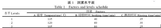 1. 4 正交設(shè)計(jì)提取方法 根據(jù)熱浸提—油重法測定原理,選定浸提溫度(A) 、浸提時(shí)間(B) 和淋洗時(shí)間(C) 作為考察因素,各設(shè)3 個(gè)水平,選用L9 (34 ) 正交表進(jìn)行試驗(yàn)(見表1) ,三次重復(fù)。
