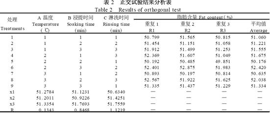1. 6 數(shù)據(jù)分析 粗脂肪含量( %) = (W2 - W1 ) ×100/ W0 ,正交試驗(yàn)結(jié)果的統(tǒng)計(jì)分析參考明道緒主編的有重復(fù)觀測值正交試驗(yàn)結(jié)果,用新復(fù)極差法進(jìn)行多重比較,在DPS 7. 05上完成。