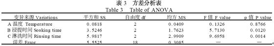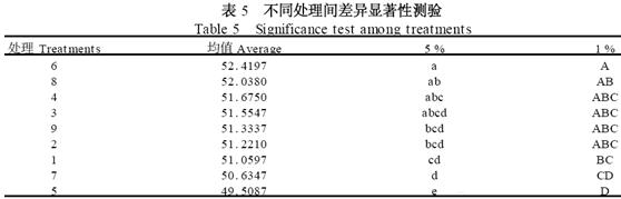 (0. 8468) > RA (0. 1343) ,即淋洗時(shí)間對(duì)測定結(jié)果影響最大,其次是浸提時(shí)間,浸提溫度的影響最小。方差分析結(jié)果表明(表3) ,因素B (浸提時(shí)間) 和因素C(淋洗時(shí)間) 各水平間差異顯著, 因素A(浸提溫度) 各水平間差異不顯著。由于因子A 不同水平間差異不顯著,結(jié)合B、C 因素各水平間的平均數(shù)和顯著性測驗(yàn)結(jié)果(表4) ,B3C3 和B3C2 應(yīng)為較好的提取方案。它們相對(duì)應(yīng)于處理3 (A1B2 C3 )和處理6 (A2B3 C2 ) ,在9 個(gè)處理中分別位于第四位和第一位(表5) 。綜上所述,A2B3 C2 應(yīng)為最優(yōu)組合,即浸提溫度120 ℃、浸提時(shí)間80 min、淋洗時(shí)間30 min 為花生粗脂肪的最佳提取方案。