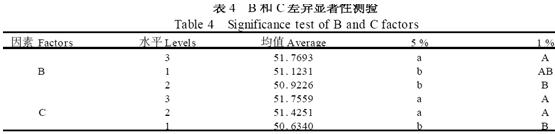對(duì)粗脂肪含量數(shù)據(jù)進(jìn)行直觀分析(表2) ,比較3個(gè)因素的極差( R) ,可見RC(1 . 1219) > RB