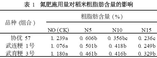 從表1中可以看出,后期不同氮肥施用量對3個品種(組合)的影響基本一致,粗脂肪含量均隨著氮肥施用量的提高而下降,且與對照差異顯著;但在N5、N10、N15 不同施肥量處理間下降趨勢比較平緩,其差異性各品種表現(xiàn)不一,其中武育粳3號、武連粳1號均不顯著,僅協(xié)優(yōu)57 的N5與N15處理分別為0. 606%和0. 236% ,差異顯著。品種間隨著氮肥量的增加,粗脂肪含量的下降趨勢有所不同,其中武育粳3號4個處理的粗脂肪含量分別為1. 180%、0. 461%、0. 416%、0. 329% ,下降趨勢稍緩于其他兩個品種(組合) 。以上結(jié)果表明,后期施用氮肥會顯著降低稻米粗脂肪含量,秈稻粗脂肪含量對氮肥的反應(yīng)敏感性比粳稻強,但隨著氮肥用量的增加,下降趨勢變緩。