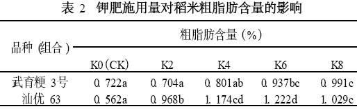 表2結(jié)果顯示,供試的兩個品種(組合)除武育粳3號的K2處理粗脂肪含量為0. 704%稍低于對照0. 722%外,其余各處理均高于對照,與對照比差異顯著(K4處理除外) ;武育粳3 號隨著施鉀量的增加而提高,汕優(yōu)63 則在超過K6 水平時顯著下降。以上結(jié)果表明,施用一定量鉀肥能增加稻米粗脂肪含量。