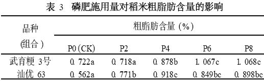 表3結(jié)果顯示,兩個品種(組合)的粗脂肪含量施磷肥處理均比對照要高,除P2處理的武育粳3號與對照差異不顯著外,其余均差異顯著,其中汕優(yōu)63在低于P4水平下,粗脂肪含量增加明顯,而武育粳3號在高于P2水平后,隨著施磷量的增加粗脂肪含量增加明顯。以上研究結(jié)果表明,施用磷肥能顯著增加稻米粗脂肪含量。