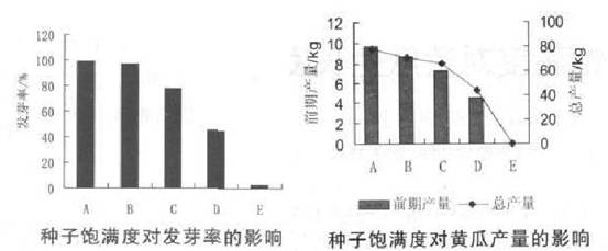 一級的黃瓜種子千粒重必須要有30g以上,這次的試驗就根據種子飽滿度不同將其分為5級:A、千粒質量30g以上;B、千粒質量25-30g;C、千粒質量22-25g;D、千粒質量18-22g;E、千粒質量18g以下。進行試驗,種子發芽試驗最好是使用種子發芽箱來進行操作。結果如下圖: