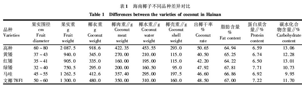 椰子種質資源的特性是決定其開發價值的主要因素,因此科研人員針對海南椰子,選取了海南高種、馬哇、文椰78F1、黃矮、綠矮和紅矮6個品種作為分析對象。通過分析其特性,總結出了它們之間的差異性和穩定性。其中各類品種的椰子都能夠從種質資源庫得到。