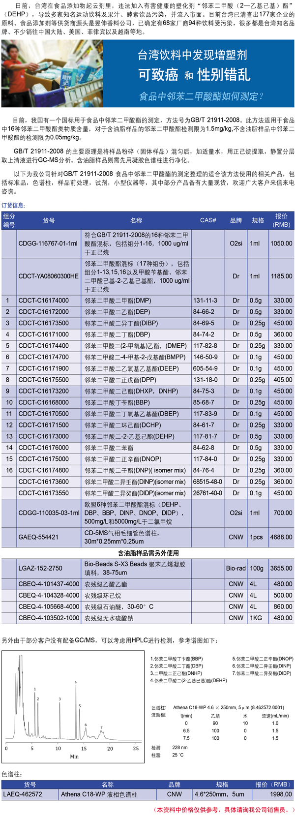 您現在的位置:中國農業儀器網 > 行業動態 >食品飲料中塑化劑的檢測方法及配套耗材