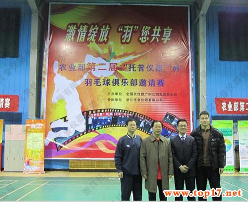 由全國農(nóng)技推廣中心羽毛球俱樂部主辦、浙江托普儀器有限公司全程贊助承辦的第二屆農(nóng)業(yè)部“托普儀器”杯羽毛球俱樂部邀請賽于2011年12月24日在北京貝特羽毛球館隆重舉行。本次比賽由農(nóng)技推廣中心杭大鵬書記主持,浙江托普儀器有限公司陳渝陽總經(jīng)理在開幕式上致辭。過程中眾位農(nóng)業(yè)部領導始終圍繞“激情綻放,羽您分享”的宗旨,以“開展文體活動,推進文化建設”為主題進行發(fā)言。并且賽后陳渝陽總經(jīng)理為獲獎人員頒發(fā)了獎項。