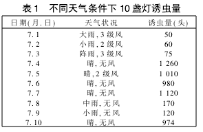 在昆蟲羽化盛期7月選擇1~10日的統(tǒng)計結(jié)果表明(表1),無風(fēng)、晴天誘蟲數(shù)量明顯高于陰雨多風(fēng)的天氣,特別是雨天誘蟲量很少,因而雨天不宜開燈。