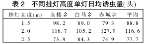 根據(jù)3點3組統(tǒng)計顯示(表2),頻振式殺蟲燈1.5 m高度單燈日均誘蟲量為88.8頭,2m高度單燈日均誘蟲量為116.6頭,2.5 m高度單燈日均誘蟲量為77.7頭,掛燈高度以2 m為最佳。