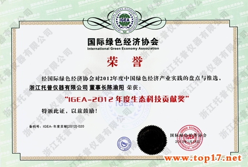 浙江托普儀器有限公司陳渝陽總經理應邀出席此次會議,并榮獲由國際綠色經濟協會頒發的“IGEA—2012年度生態科技貢獻獎”,此獎項是經國際綠色經濟協會對2012年度中國綠色經濟產業時間的盤點與推選而獲得。