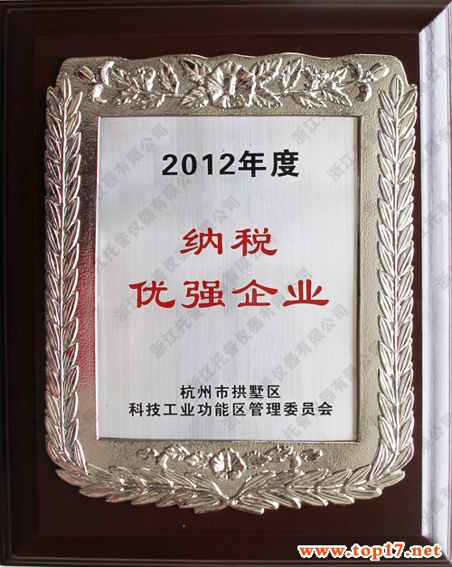 為進一步深入落實杭州市扶優(yōu)扶強政策,提高企業(yè)的整體實力和經(jīng)濟水平,根據(jù)杭州市拱墅區(qū)科工區(qū)[2012]13號文件精神,杭州市拱墅區(qū)科技工業(yè)功能區(qū)管委會研究決定表彰浙江托普儀器有限公司為2012年“納稅優(yōu)強企業(yè)”。