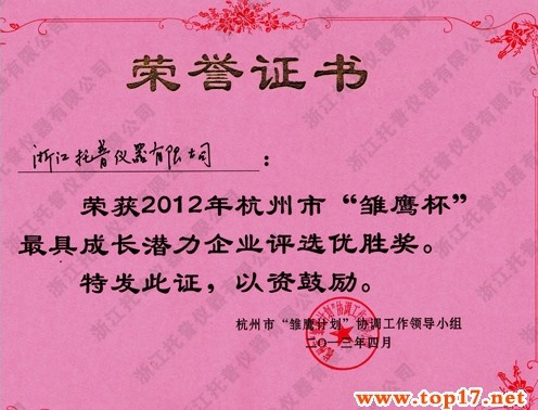 應杭州市科學技術委員會邀請,昨日下午于浙江省廣電總局演播室,公司總經理陳渝陽參加了“2012年杭州市‘雛鷹杯’最具成長潛力企業“評選總決賽及頒獎典禮。浙江托普儀器有限公司榮獲“雛鷹杯”最具成長潛力企業12強殊榮。