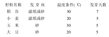 1.1水分。 是糧食籽粒發芽的第一條件,有了水分,細胞內各種酶開始活化,籽粒內貯存的營養物質才能被水解轉化,種胚細胞就能分裂成長,糧食才能萌動和發芽。各種糧食籽粒發芽所需最低水分因品種有異而不同,通常禾谷類糧食的最低水分在22.%~6.%之間。豆類油料的最低水分大約在12%~19%之間。另外,籽的大小不同,品種不同,需水量也不同。籽粒發芽用水試驗應當不含酸、堿或其它雜質。