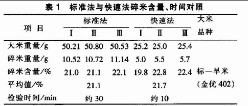 從檢驗過雜質的大米樣品中,用分樣器平均分取約25g大米,倒人合適也徑的篩層內,以每秒1轉的速度,回轉半徑約10 cm,在玻璃板上正反時針回轉各篩10圈,取出篩,將篩上大米小心倒在玻璃板一端,將篩下物倒人樣品盤內,重新套好篩層,再將篩下物倒人篩內,以同樣的方法再篩選2次。第二次正反時針回轉各篩8圈,第三次篩4圈。將篩上物和篩下物分開倒在玻璃板上。按規定揀出碎米中的整米、整米中的碎米,用感量0.1 g的天平稱取碎米重量,計算碎米含量,記錄每次檢驗時間。檢驗結果對照見表1、表2