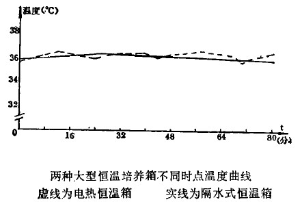 2.1 用額定的溫度范圍(36士0.5℃)為標準,與兩種培養箱的平均溫度曲線相比較,盡管這兩種恒溫箱的溫度曲線全部都在額定溫度范圍內,但是相比之下隔水箱的溫度曲線比電熱箱的要平穩些(圖示),這說明前者的平均溫度較后者穩定。