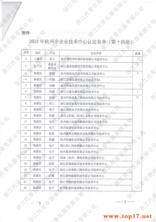 經企業申報各有關單位推薦,并組織專家評審、社會公示、經杭州市經信委和財政局研究認定浙江托普儀器有限公司等65家企業技術中心為2013年杭州市企業技術中心(第十四批)。