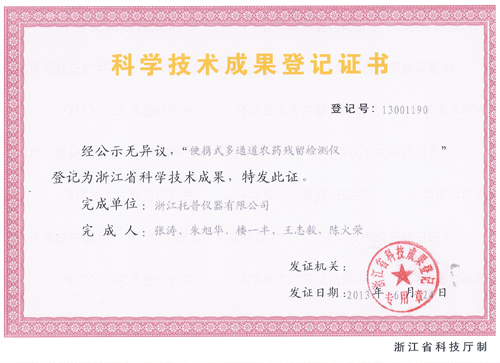 熱烈祝賀托普便攜式多通道農(nóng)藥殘留檢測(cè)儀獲得科學(xué)技術(shù)成果登記證書(shū)
