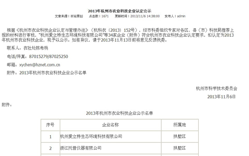 根據《杭州市農業科技企業認定與管理辦法》(杭科農〔2013〕152號),經市科委組織專家對各區、縣(市)科技局推薦上報的材料進行審核,“浙江托普儀器有限公司”等34家企業(附件)符合杭州市農業科技企業認定要求,擬認定為2013年杭州市農業科技企業。