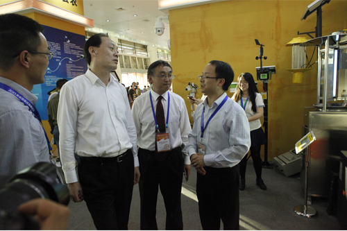 圖為:余欣榮副部長和王小兵副司長一行蒞臨托普展區