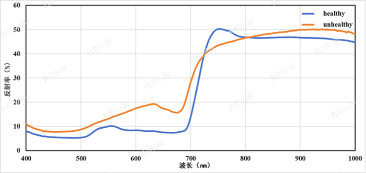 7.病蟲害分析:可適用于植物病蟲害試驗(yàn),進(jìn)行病斑部分和健康部分光譜反射曲線進(jìn)行對比,通過對變化趨勢的研究可以對病害發(fā)生部分和嚴(yán)重程度進(jìn)行分析;