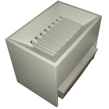 橫格式分樣器簡稱橫格分樣器,其材質是鐵板噴塑,構造簡單實用,凹槽排列成一直行。