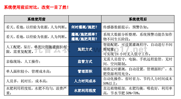 整個系統可根據監測的土壤水分、作物種類的需肥規律,設置周期性水肥計劃實施輪灌。施肥機會按照用戶設定的配方、灌溉過程參數自動控制灌溉量、吸肥量、肥液濃度、酸堿度等水肥過程的重要參數,實現對灌溉、施肥的定時、定量控制,充分提高水肥利用率,實現節水、節肥,改善土壤環境,提高作物品質的目的。該系統廣泛應用于大田、旱田、溫室、果園等種植灌溉作業。