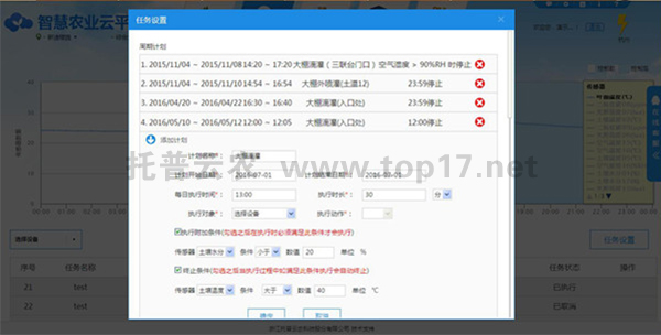 添加水肥任務計劃,設置周期計劃,實現全智能控制自動控制。用戶設定監控條件后,可完全自動化運行,遠程控制生產現場的各種農用設施和農機設備,快速實現溫室大棚、大田種植