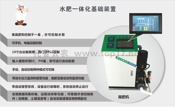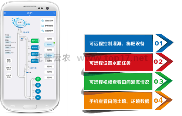 托普水肥一體化智能灌溉系統可以幫助生產者很方便的實現自動的水肥一體化管理。系統由系統云平臺、墑情數據采集終端、視頻監控、施肥機、過濾系統、閥門控制器、電磁閥、田間管路等組成。