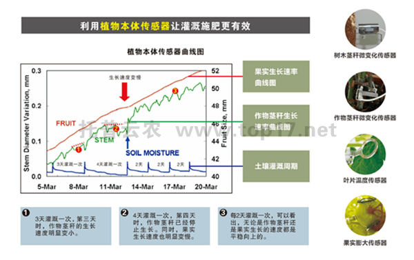 植物本體傳感器,能實時或階段性地監測植物莖稈粗細的變化、葉面的溫度、莖流速率、果實增重與膨大速率、植物的光合作用等植物本身的一些參數,能直觀地反應植物的生長狀態。